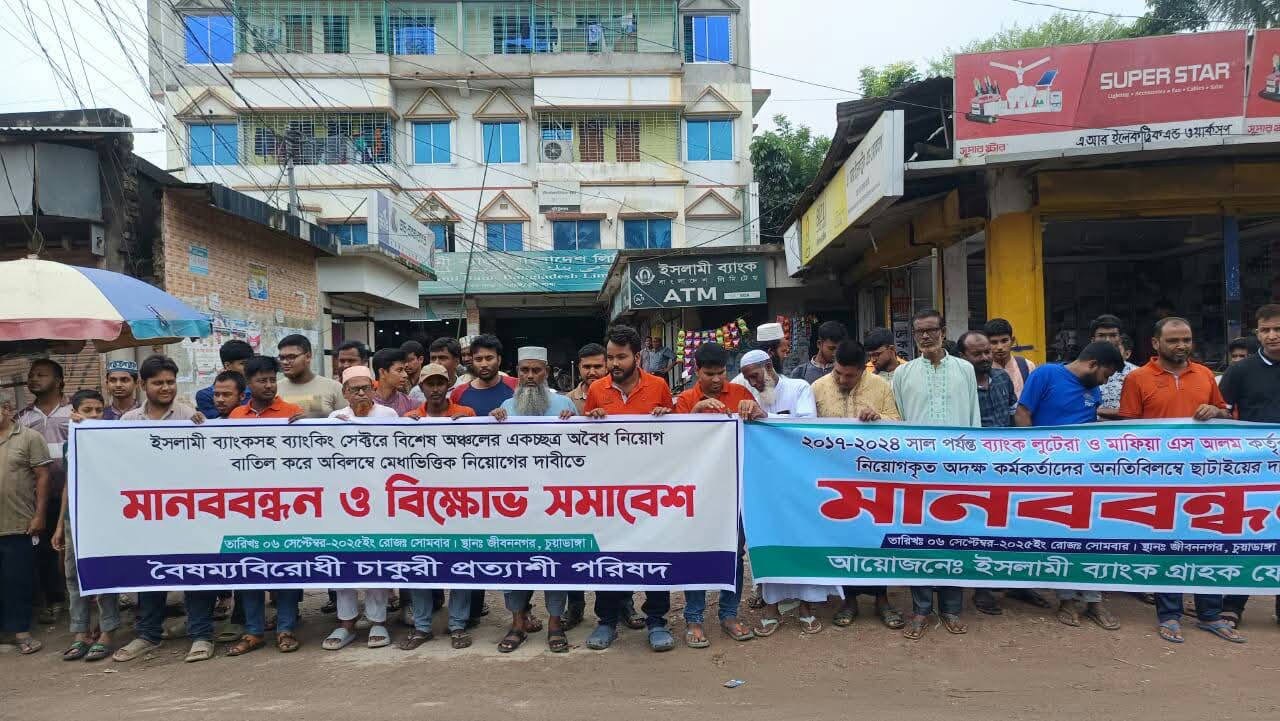 মোঃ মুনাইম হোসেন, জীবননগর প্রতিনিধি:ইসলামী ব্যাংকে এস আলম গ্রুপ প্রভাব খাটিয়ে ‘অবৈধভাবে’ ও ‘অদক্ষদের’ নিয়োগের বিরুদ্ধে বিক্ষোভ ও মানববন্ধন করেছে সচেতন ব্যাংকার সমাজ, ইসলামী ব্যাংক গ্রাহক ফোরাম ও বৈষম্যবিরোধী চাকুরি প্রত্যাশী পরিষদ । মানববন্ধন থেকে তারা অবৈধ নিয়োগ বাতিলের দাবি জানান।