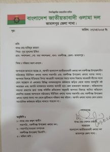 বকশীগঞ্জের বাট্টাজোর ইউনিয়ন জাতীয়তাবাদী ওলামা দলের সভাপতি হামিদুর রহমান বহিস্কার