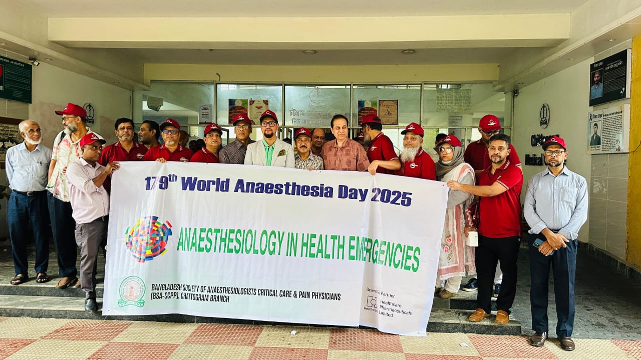 মোহাম্মদ মাসুদ;ঐতিহাসিক ১৭৯তম বিশ্ব এনেসথেসিয়া দিবস নানা আনুষ্ঠানিকতায় পালিত হয়েছে । এবারের প্রতিবাদ্য বিষয় হলো “জরুরী স্বাস্থ্য সেবায় অবেদনবিদ্যা। চমকে ও বিএসএ- সিসিপিপি ,চট্রগ্রাম শাখা এবং ডিপার্টমেন্ট অফ এনেসথেসিয়া ,পেইন এবং প্যালিয়েটিভ মেডিসিন এর উদ্যোগে দিবসটি উদযাপিত হয়েছে।