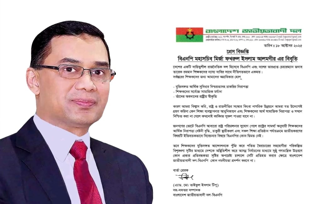 তবে তিনি সতর্ক করে দেন—শিক্ষকদের যুক্তিসংগত আন্দোলনকে অজুহাত করে যদি কেউ পরিকল্পিতভাবে বিশৃঙ্খলা সৃষ্টি করে দেশকে অস্থিতিশীল করার চেষ্টা করে, অথবা আসন্ন নির্বাচনের গণতান্ত্রিক প্রক্রিয়াকে ব্যাহত করতে চায়, বিএনপি তখন কোনো ছাড় দেবে না।
