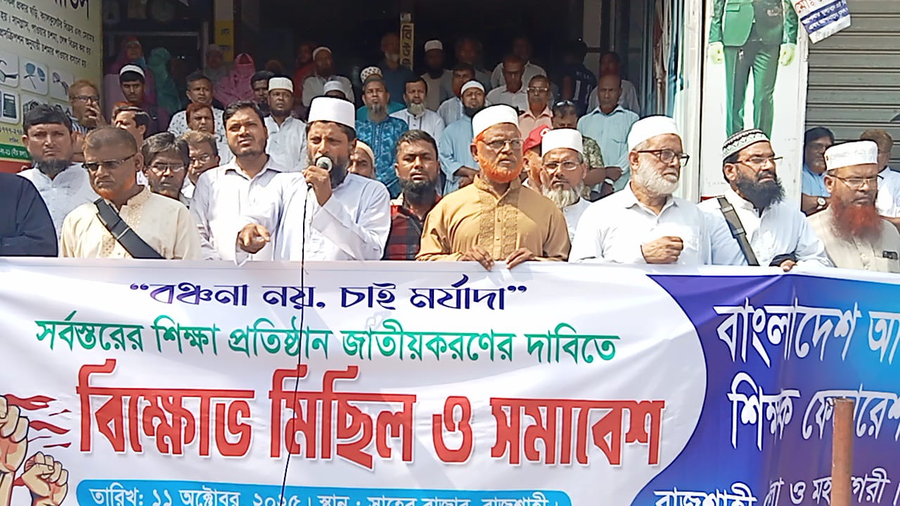 মো: এরশাদ আলী, স্টাফ রিপোর্টার, রাজশাহী;আজ ১১ই অক্টোবর ২০২৫, রোজ শনিবার। সকাল দশ ঘটিকার সময় রাজশাহী জিরো পয়েন্টে “বঞ্চনা নয়, চাই মর্যাদা” ব্যানারে এমন লেখা নিয়ে সর্ব স্তরের শিক্ষা প্রতিষ্ঠান জাতীয়করণ ও শিক্ষক দের সকল যৌক্তিক দাবি বাস্তবায়নের লক্ষে এক বিক্ষোভ মিছিল ও সমাবেশ অনুষ্ঠিত হয়। শিক্ষকদের এই বিক্ষোভ মিছিল ও সমাবেশের আয়োজন করেন বাংলাদেশ আদর্শ শিক্ষক ফেডারেশন, রাজশাহী জেলা ও মহানগরী। উক্ত সমাবেশে রাজশাহী জেলার সকল উপজেলা থেকে ও রাজশাহী মহানগরী থেকে সর্ব স্তরের শিক্ষা প্রতিষ্ঠানের অনেক প্রতিষ্ঠান প্রধান ও সহকারী শিক্ষক গণ অংশ গ্রহন করেন। সমাবেশে জেলা, মহানগরী ও উপজেলার দায়িত্ব শীল ফেডারেশনের শিক্ষক নেতৃ বৃন্দ গণ সারাদেশের শিক্ষা প্রতিষ্ঠান জাতীয় করণ সহ নানাবিধ দাবি নিয়ে পৃথক পৃথক গুরুত্বপূর্ণ আলোচনা করেন। বক্তারা শিক্ষা মন্ত্রনালয়ের দায়িত্ব শীল কর্মকর্তা দের উদ্দেশ্যে বলেন অবিলম্বে দেশের সকল শিক্ষা প্রতিষ্ঠান জাতীয় করণ করতে হবে। বক্তারা বলেন শিক্ষক দের বাড়ি ভাড়া ৫০% করতে হবে, সকল নন এমপিও শিক্ষা প্রতিষ্ঠান এমপিও ভুক্ত করতে হবে, নৈতিক শিক্ষা ব্যবস্হা নিশ্চিত করতে হবে, বৈষম্যহীন শিক্ষা ব্যবস্হা চালু করতে হবে, স্বতন্ত্র ইবতেদায়ী সকল মাদ্রাসা জাতীয় করণ করতে হবে। বক্তারা আরো বলেন কোন শিক্ষা অফিসে শিক্ষক দের যেন হয়রানির শিকার হতে না হয়। কোন শিক্ষা অফিসার যেন ঘুষ না নেন। শিক্ষক দের কোন ফাইল যেন আটকে না থাকে, ইত্যাদি শিক্ষক দের দাবি নিয়ে আলোচনা করেন।