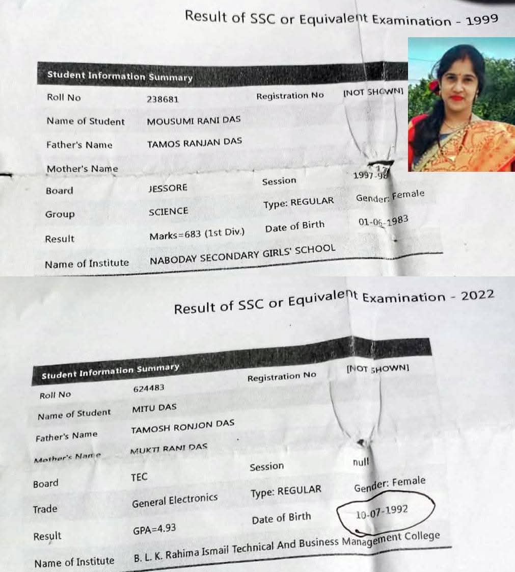 রাসেল হোসেন, ঝিনাইদহ প্রতিনিধি:ঝিনাইদহের শৈলকুপা মালিথিয়া আদিল উদ্দিন ডিগ্রী কলেজের ল্যাব এসিস্ট্যান্ট মৌসুমি রানী দাসের বিরুদ্ধে জন্মনিবন্ধন জালিয়াতির অভিযোগ উঠেছে। শুধু জন্মনিবন্ধনই নয়, মৌসুমির একাধিক জন্ম তারিখ ও ভিন্ন ভিন্ন নামে এসএসসির সনদ মিলেছে। এ নিয়ে এলাকায় তোলপাড় শুরু হয়েছে। বন্ধ হয়ে গেছে মৌসুমি দাসের সরকারী বেতনের অংশ।