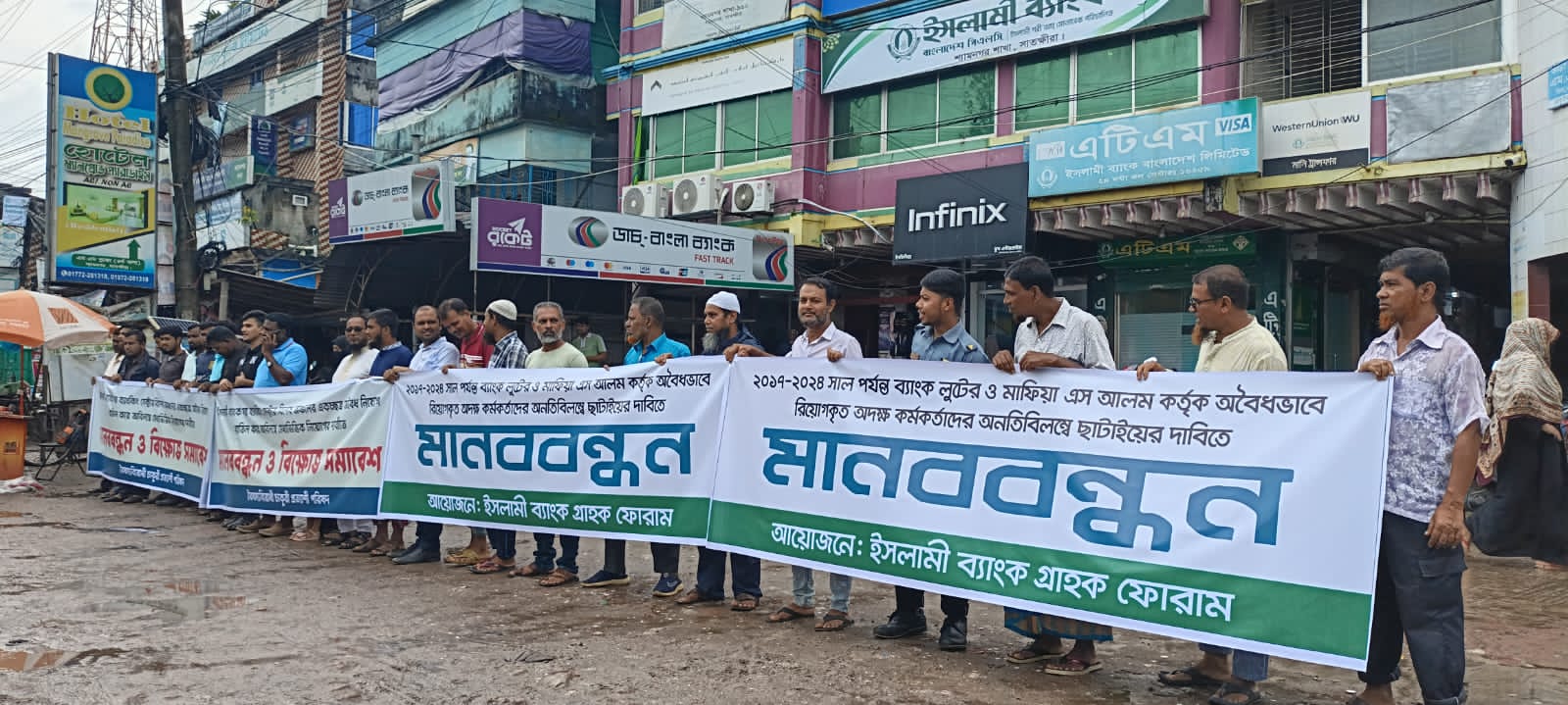 তারা আরও বলেন, ব্যাংক লুটেরা ও মাফিয়া হিসেবে পরিচিত এস আলম কর্তৃক ২০১৭ থেকে ২০২৪ সাল পর্যন্ত ইসলামী ব্যাংকসহ বিভিন্ন ব্যাংকে অবৈধভাবে অদক্ষ কর্মকর্তা-কর্মচারী নিয়োগ দিয়েছে। এস আলম কর্তৃক পাচারকৃত কোটি কোটি টাকা দ্রুত দেশে ফেরত এনে সরকারের জব্দকৃত সম্পদের মাধ্যমে তার দায়দেনা সমন্বয়ের উদ্যোগ নিতে হবে। পাশাপাশি যারা মিথ্যা তথ্য ও অপপ্রচারের মাধ্যমে ইসলামী ব্যাংকের সুনাম ক্ষুণ্ণ করছে, তাদের বিরুদ্ধেও কঠোর আইনগত ব্যবস্থা গ্রহণের আহ্বান জানানো হয়।মানববন্ধনে বক্তব্য রাখেন মোঃ রাশিদুল ইসলাম, মোঃ মাছুম বিল্লাহ, মোঃ জাহাঙ্গীর আলম (গ্রাহক), মোঃ জাহিদ হাসান এবং মোঃ মোমিনুর রহমান।বক্তারা বলেন, ইসলামী ব্যাংক দেশের অর্থনীতির অন্যতম প্রাণশক্তি। এ ব্যাংকের ভাবমূর্তি রক্ষায় সরকারের কার্যকর পদক্ষেপ গ্রহণ জরুরি। তারা আশাবাদ ব্যক্ত করেন, দেশের সাধারণ গ্রাহক, চাকরিপ্রত্যাশী তরুণ ও সৎ ব্যাংক কর্মকর্তাদের প্রত্যাশা পূরণে দ্রুত ন্যায়সংগত ব্যবস্থা নেওয়া হবে।