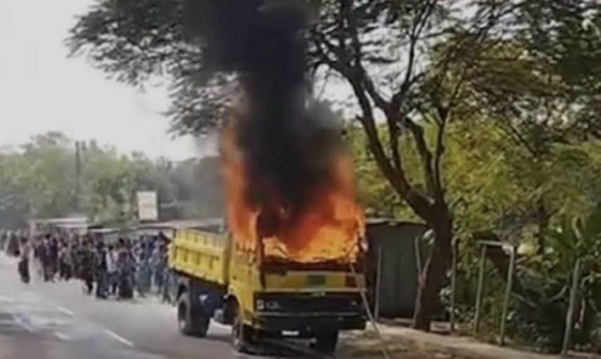 রাজবাড়ী গোয়ালন্দে মোটরসাইকেল চাপা দেয়া ট্রাকে অগ্নিসংযোগ