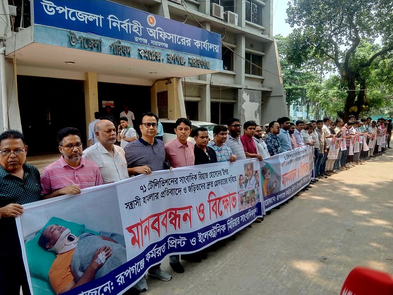 রূপগঞ্জে ৭১ টেলিভিশনের রূপগঞ্জ প্রতিনিধি সাংবাদিক রিয়াজ হোসেনের উপর সন্ত্রাসী হামলার প্রতিবাদে ও জড়িতদের দ্রুত গ্রেপ্তারের দাবীতে মানববন্ধন