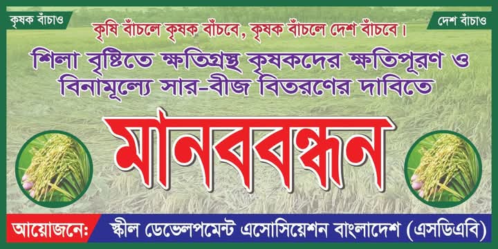 স্কীল ডেভেলপমেন্টের আয়োজনে কৃষকদের মাঝে বিনামূল্যে সার-বীজ বিতরণের দাবিতে মানববন্ধন