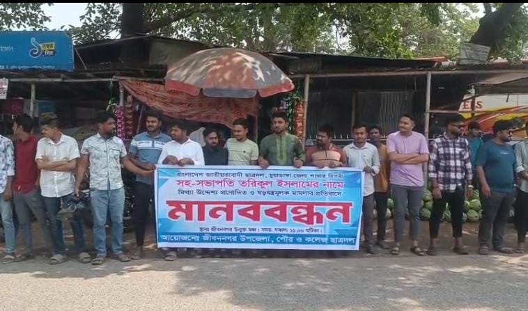 চুয়াডাঙ্গা জেলা ছাত্রদলের সহসভাপতির বিরুদ্ধে ‘হয়রানিমূলক’ হত্যা মামলা প্রত্যাহারের দাবিতে জীবননগরে মানববন্ধন। চুয়াডাঙ্গা জেলা ছাত্রদলের সহসভাপতি তরিকুল ইসলামের বিরুদ্ধে ‘হয়রানিমূলক’