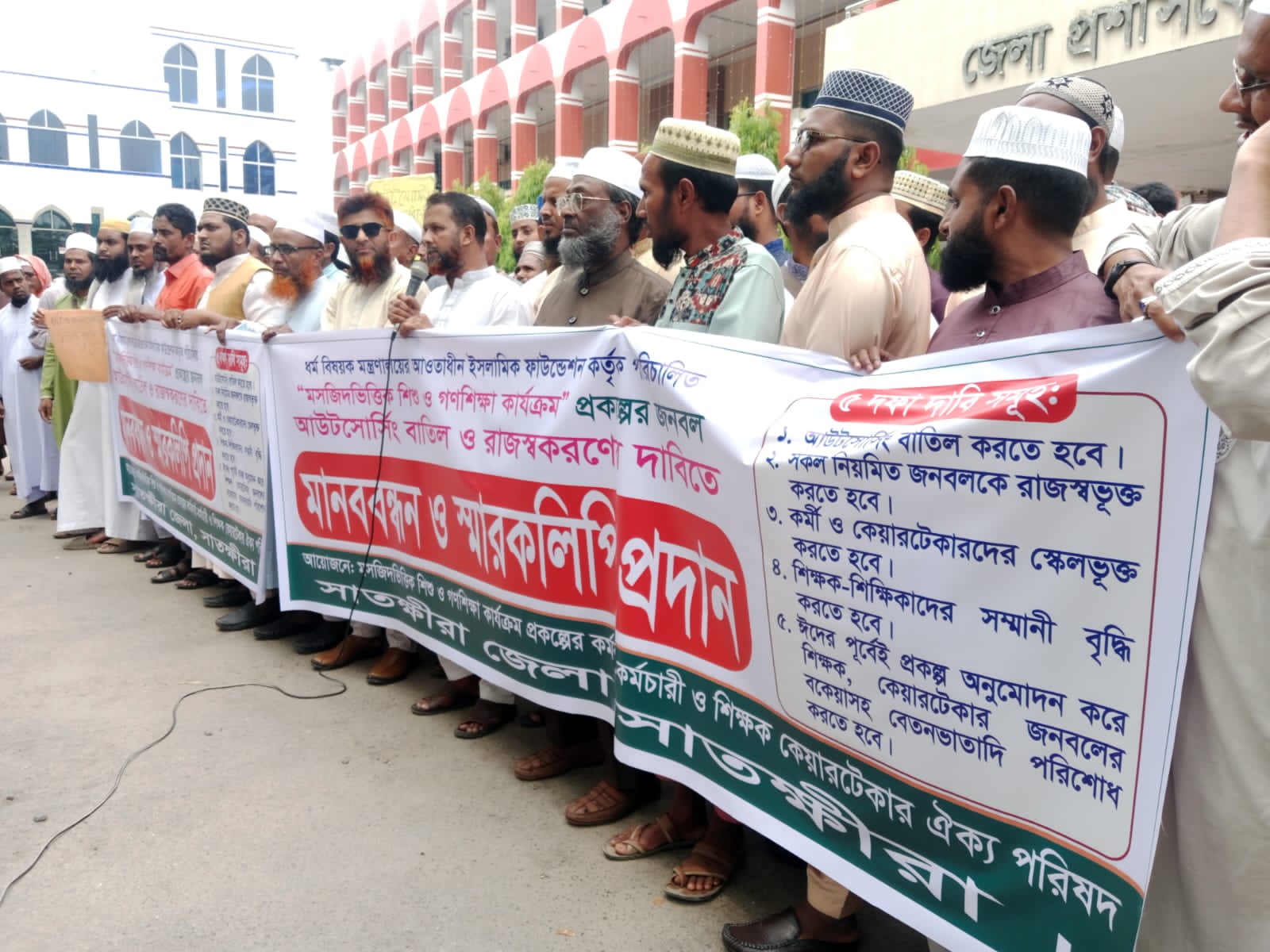 সাতক্ষীরায় মসজিদ ভিত্তিক শিশু ও গণশিক্ষা কার্যত্রম জাতীয়করণ না করে আউটসোসিং করার প্রতিবাদে মানববন্ধন