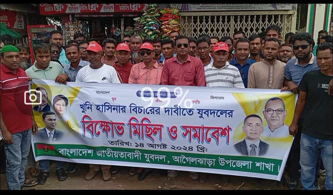 আগৈলঝাড়ায় খুনি হাসিনার বিচারের দাবিতে যুবদলের বিক্ষোভ মিছিল ও সমাবেশ