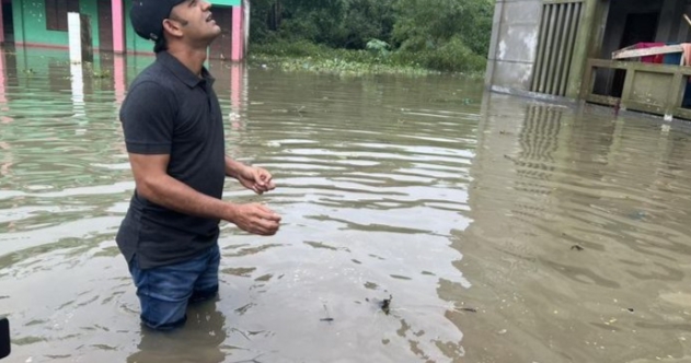 পানিতে নেমে বন্যার্তদের খোঁজ নিচ্ছেন ব্যারিস্টার সুমন