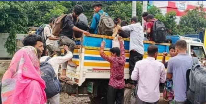 বাসে বাড়তি ভাড়া, গরুর ট্রাকেও বাড়ি ফিরছে মানুষ