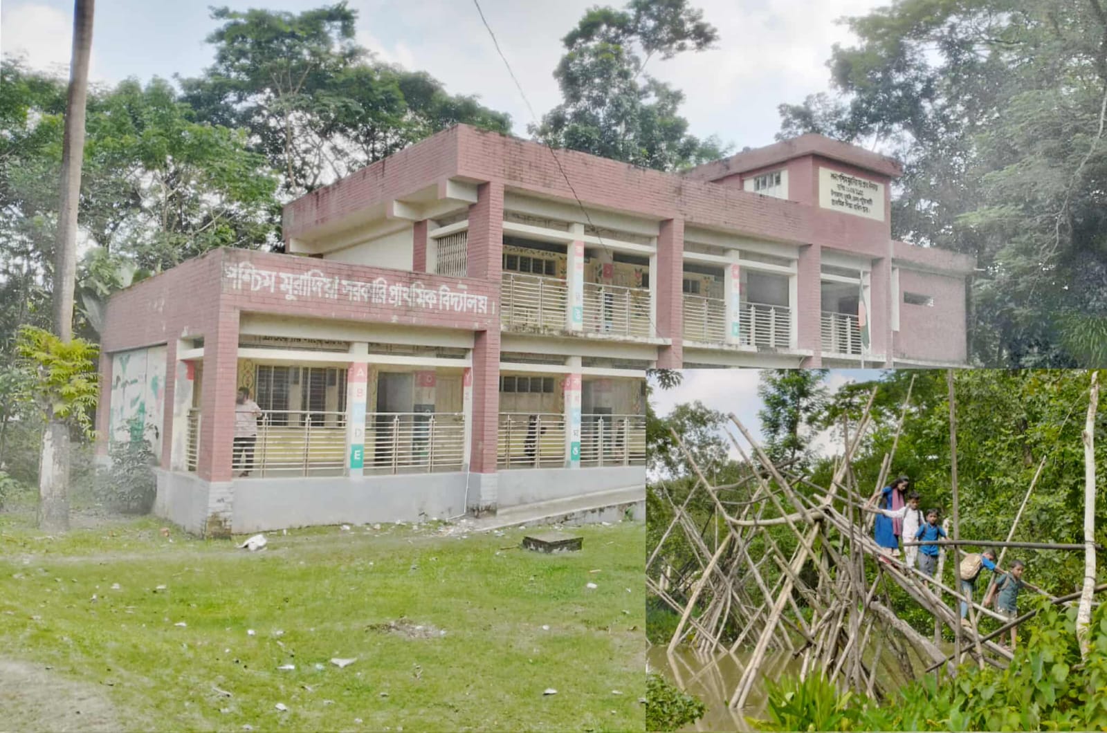 দুমকীতে স্কুলপথে ঝুঁকিপূর্ণ বাঁশের সাঁকো